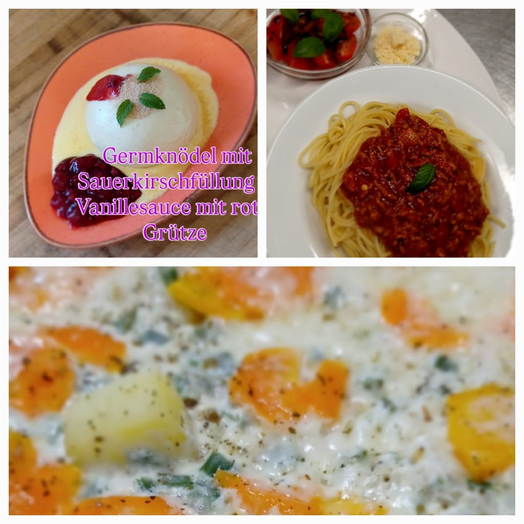 Germknödel mit Sauerkirschfüllung in Vanillesauce mit roter Grütze 7,20 €