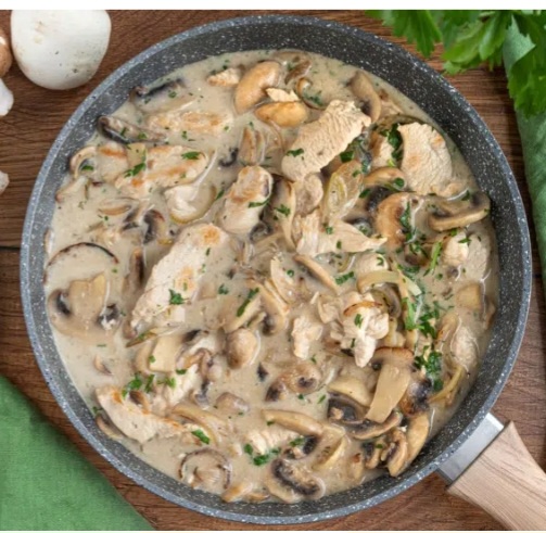 Putengeschnetzeltes mit Champignons, Reis u. Tomatensalat 10,50 €